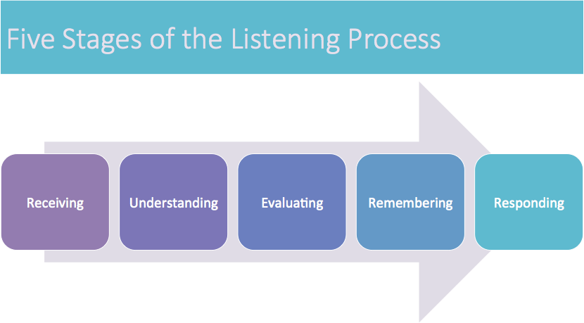 The listening process involves five stages: receiving, understanding, evaluating, remembering, and responding. These stages will be discussed in more detail in later sections. An effective listener must hear and identify the speech sounds directed toward them, understand the message of those sounds, critically evaluate or assess that message, remember what’s been said, and respond (either verbally or nonverbally) to information they’ve received.