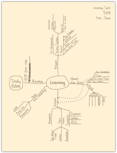 This is a very graphic method of note-taking that is especially good at capturing the relationships among ideas. Concept maps harness your visual sense to understand complex material “at a glance.” They also give you the flexibility to move from one idea to another and back easily (so they are helpful if your instructor moves freely through the material).