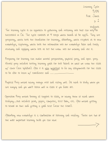 You will have noticed that all methods end with the same step: reviewing your notes as soon as possible after class. Any review of your notes is helpful (reading them, copying them into your computer, or even recasting them using another note-taking method). But THINK! Make your review of notes a thoughtful activity, not a mindless process. When you review your notes, think about questions you still have and determine how you will get the answers. (From the next class? Studying with a friend? Looking up material in your text or on the net?) Examine how the material applies to the course; make connections with notes from other class sessions, with the material in your text, and with concepts covered in class discussions. Finally, it’s fun to think about how the material in your notes applies to real life. Consider this both at the very strategic level (as in “What does this material mean to me in relation to what I want to do with my life?”) as well as at a very mundane level (as in “Is there anything cool here I can work into a conversation with my friends?”).